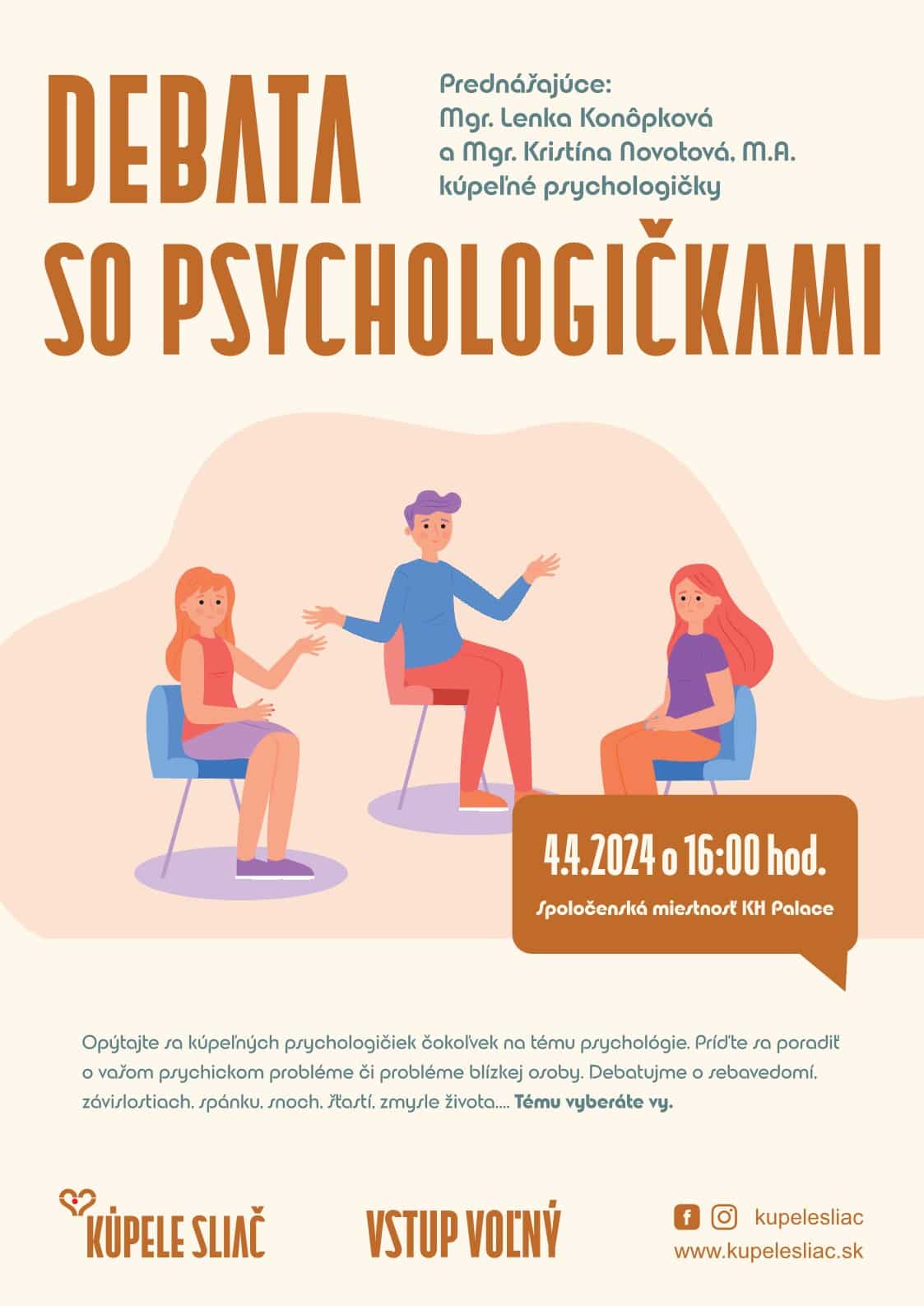 Opýtajte sa kúpeľných psychologičiek čokoľvek na tému psychológie. Príď te sa poradiť o vašom psychickom probléme či probléme blízkej osoby. Debatujme o sebavedomí, závislostiach, spánku, snoch, šťastí, zmysle života…. Tému vyberáte vy