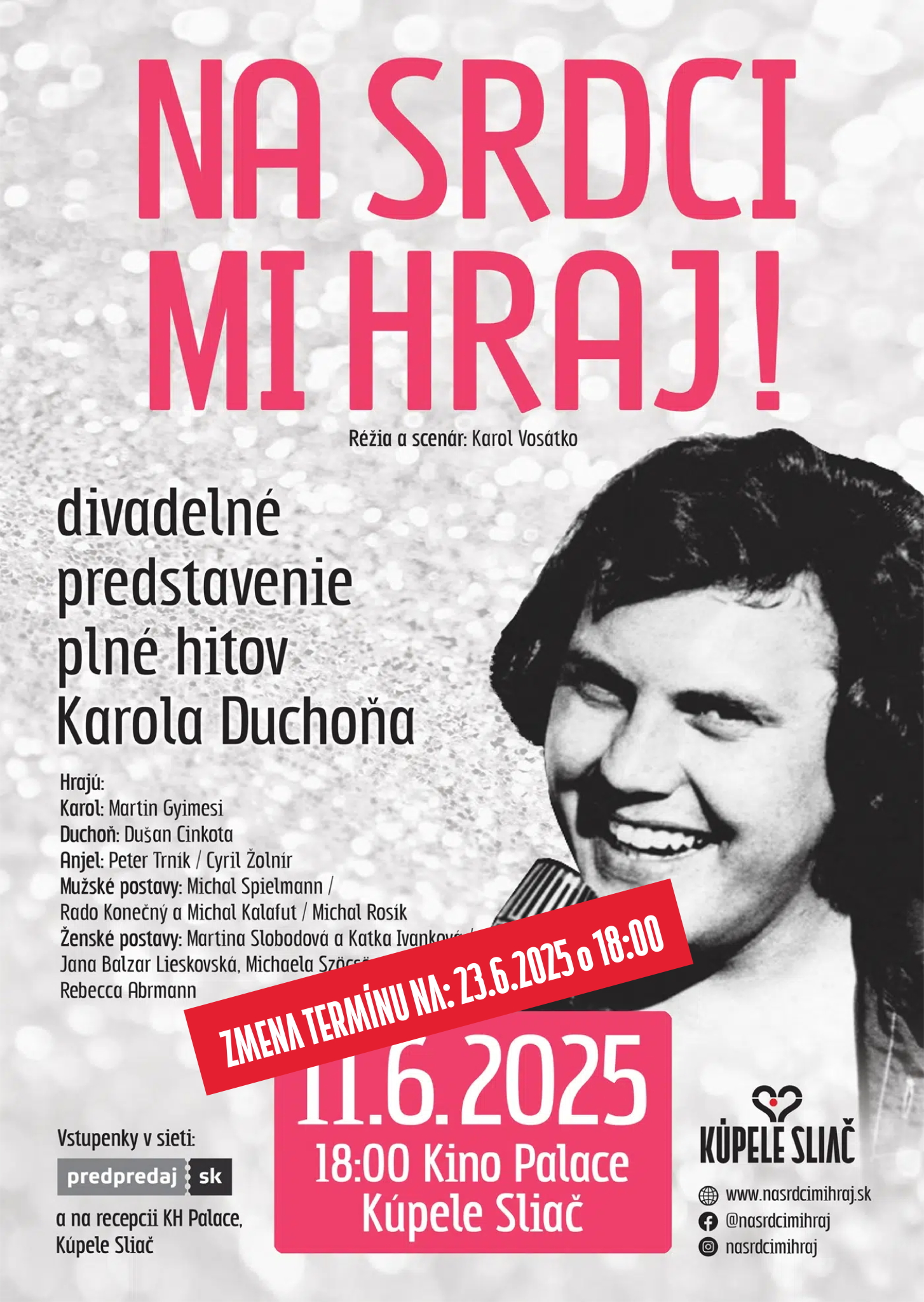 Podujatie Na srdci mi hraj!, ktoré sa malo konať v termíne 11.6.2025 o 18:00 sa presúva na nový termín 23.6.2025 o 18:00. Vstupenky zostávajú v platnosti. V prípade nevyhovujúceho náhradného termínu môžu zákazníci požiadať o vrátenie peňazí. Túto žiadosť je potrebné odoslať do dňa 11.6.2025 (vrátane). Zákazníci, ktorí si zakúpili vstupenky prostredníctvom stránky predpredaj.sk dostanú túto informáciu emailom. V prípade nedoručenia emailu skontrolujte priečinok spam / nevyžiadaná pošta, prípadne kontaktujte reklamacie@predpredaj.sk