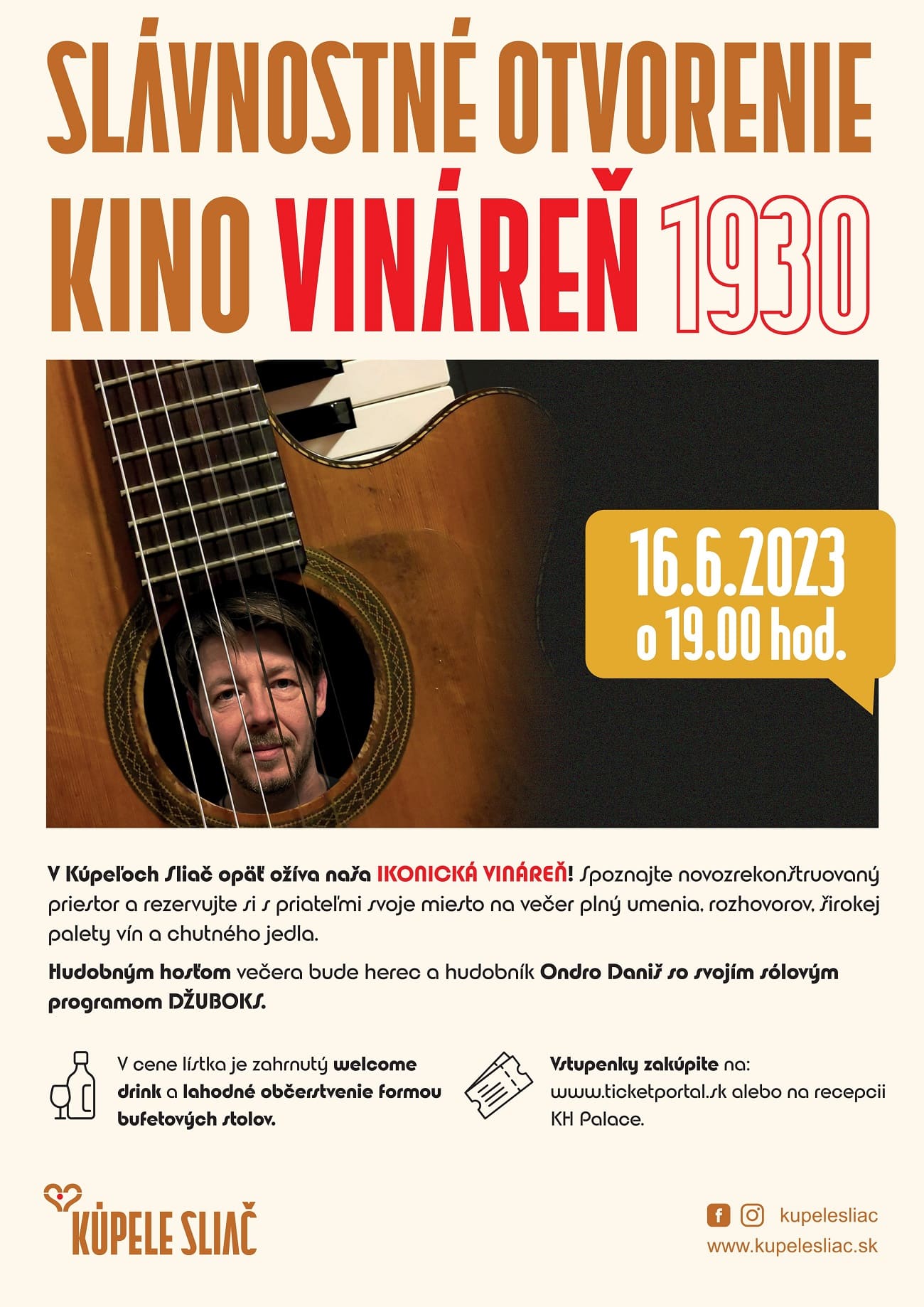 V roku 1930 bola otvorená Kino Vináreň, ktorá v našich kúpeľoch opäť ožíva. Chceme tak poukázať na dôležitosť tradícii a miest v Kúpele SLIAČ, na ich kultúrnu aj historickú hodnotu. Kino Vináreň nesie názov podľa roku pôvodného založenia a už o týždeň privíta prvých hostí po 50-rokoch od prerušenia jej prevádzky. Vstupenky na www.ticketportal.sk alebo na recepcii KH Palace.